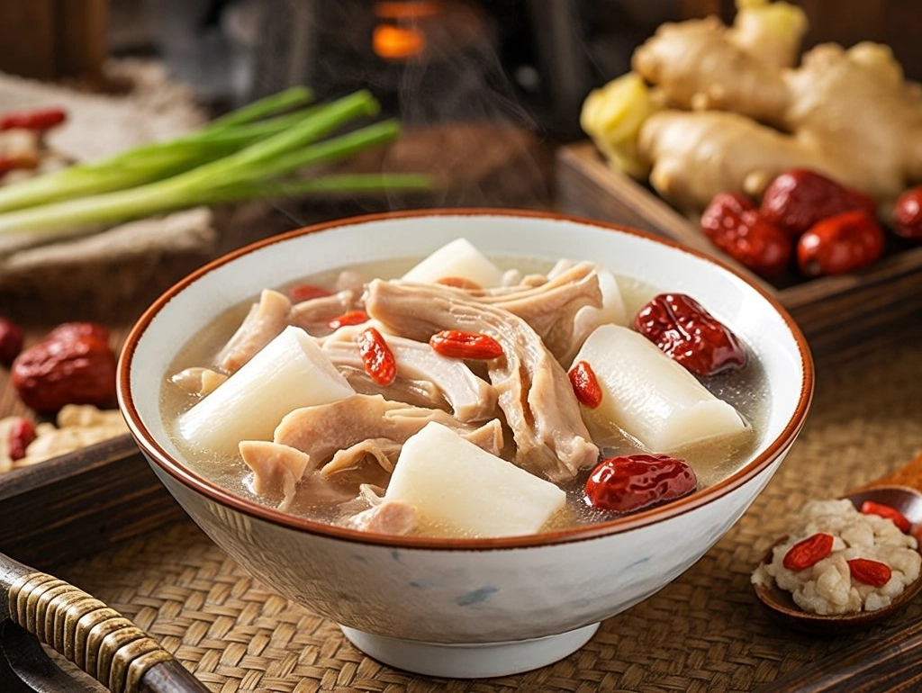 炖煮汤品:将焯水后的猪肚条放入砂锅中。加入山药块、茯苓、莲子、芡实和红枣(如果使用),加入足够量的清水,武火煮开后转文火慢炖。炖煮过程中可适时撇去浮沫,保持汤品清澈,炖煮约1.5-2小时,直到猪肚和山药都变得软烂。